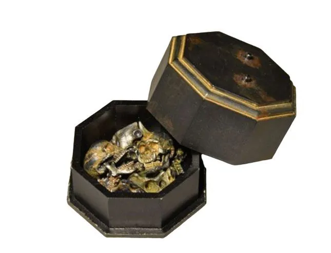 Жуткая, но очень интересная окимоно-фигурка cкелета от японского художника Такаси Ямагучи и скульптора Такаюки Такея. В комплекте множество дополнительных элементов. В том числе специальное крепление-позвоночник, чтобы делать фигурке две головы. Также в комплекте подставка-коробочка, в которой можно хранить все элементы.